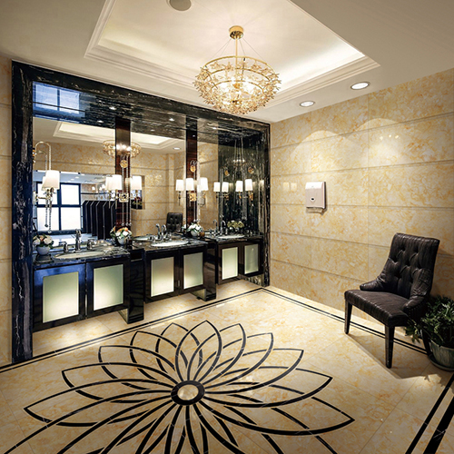 祥瑞滿屋,華貴大氣。蜜黃圓紋星羅棋布點綴于米黃色磚面,柔而不媚妍而不艷,肌理細膩觸手溫潤,鋪貼空間清爽舒暢,讓人心緒寧靜。